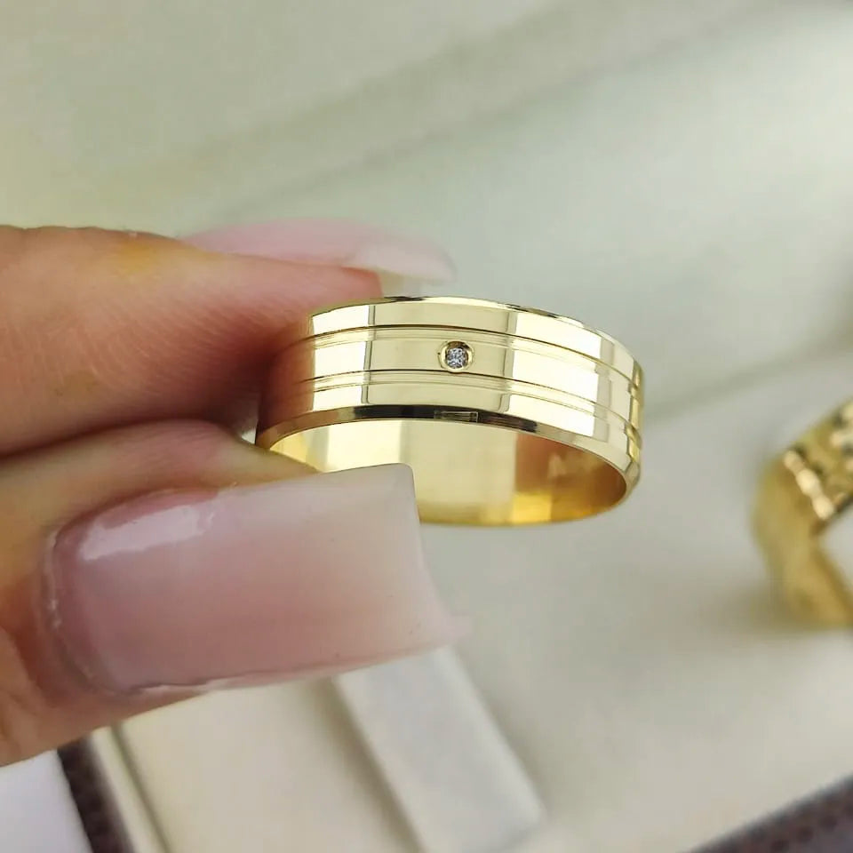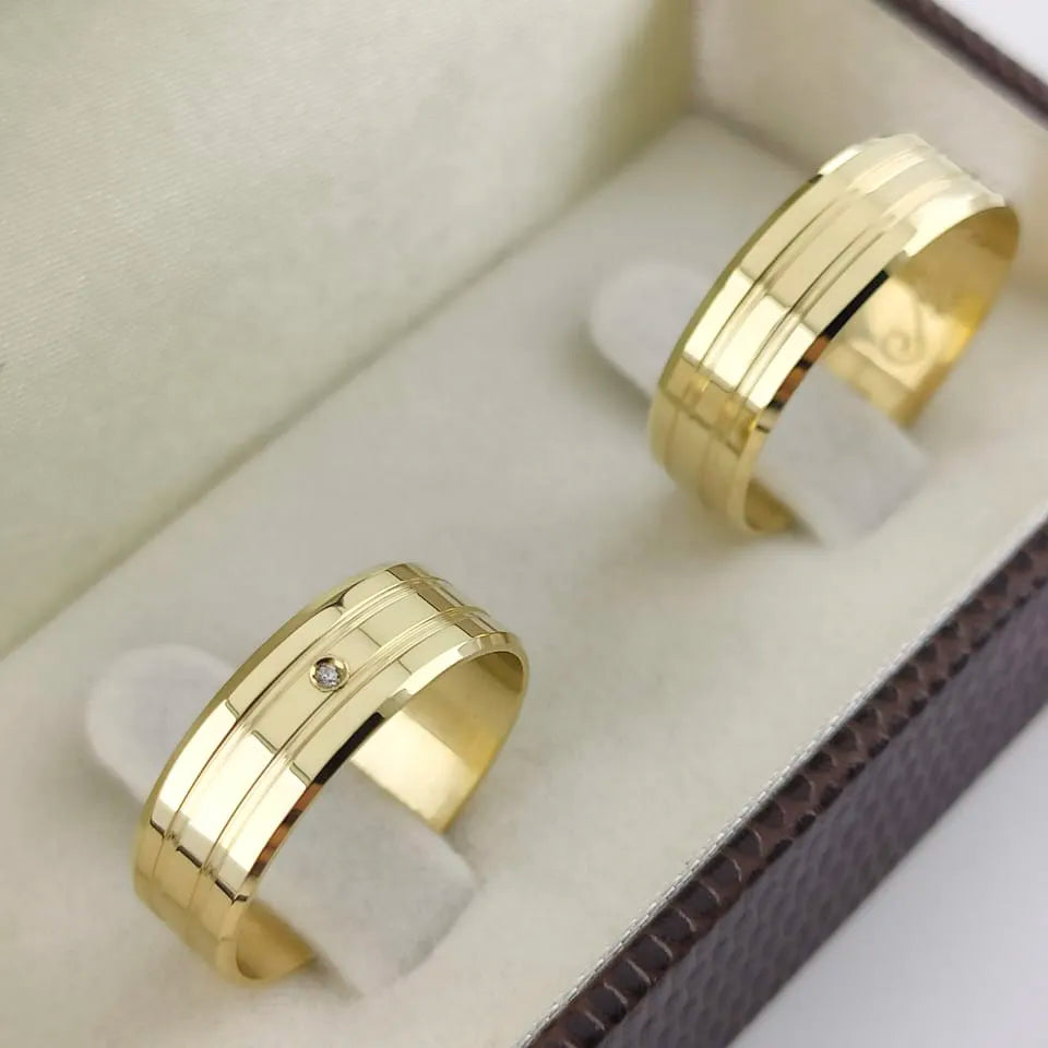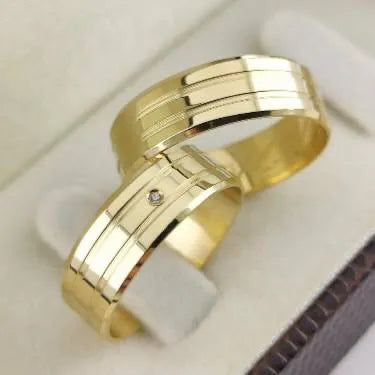 Metal: OURO 18k 750 Peso médio: 7 gramas o par Largura: 6mm Acabamento: Polida / Chanfrada / 1 Pedra na Feminina